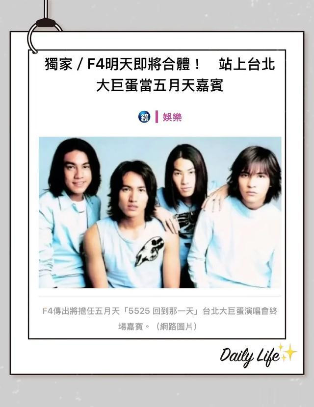前段时间媒体报道F4明年将合体开演唱会,很多网友表示期待,毕竟《流星花园》陪伴了很多人,可惜杉菜不在了!如果F4真的合体了,这将是他们复出演唱会前的首秀!